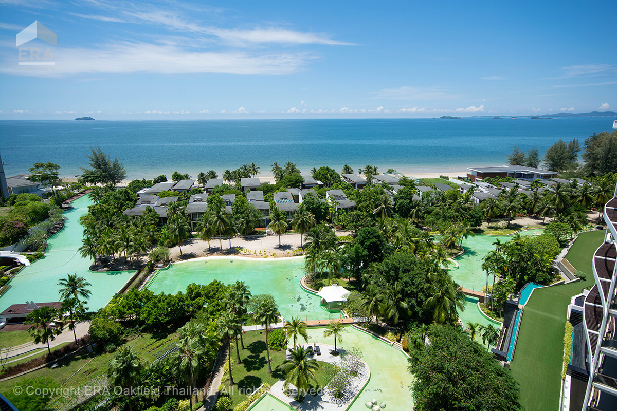 #93829. Welcome to the most exclusive and sought-after location in Rayong. This apartment offers direct beach access, with no roads to cross, and boasts world-class views. Located next door to the 5-star Marriott Hotel, you can indulge in fine dining just steps away. The pool area is a true oasis, featuring beautiful islands, bridges, and waterfalls – simply step down and enjoy the serene surroundings. The living space is thoughtfully designed, featuring a bedroom, living room/kitchen, 2 bathrooms, and a spacious, lovely balcony for ultimate relaxation.